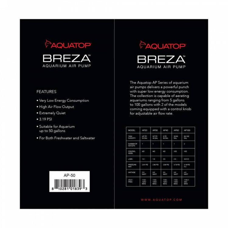 Provide strong, reliable aeration for your aquarium with the Aquatop AP-50 Air Pump. Designed for tanks 20 to 50 gallons, this quiet, energy-efficient air pump delivers consistent airflow to maintain healthy oxygen levels for fish and plants. Perfect for air stones, sponge filters, and bubble decorations, it’s ideal for both freshwater and saltwater aquariums.