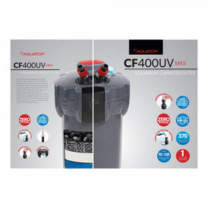 Keep your aquarium crystal clear with the Aquatop CF-400UV MKII Canister Filter, featuring Vortex Prime technology and built-in 9W UV sterilizer. Designed for aquariums up to 125 gallons, this powerful filter delivers 3+1 stages of filtration—mechanical, chemical, biological, and UV sterilization—for maximum water clarity and quality. With a 370 GPH flow rate, 35W power draw, and included filter media (bio balls, carbon, and filter pads), it offers reliable, quiet performance for both freshwater and saltwater systems.