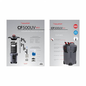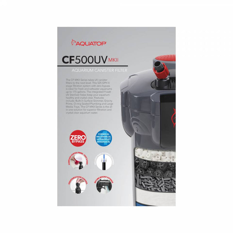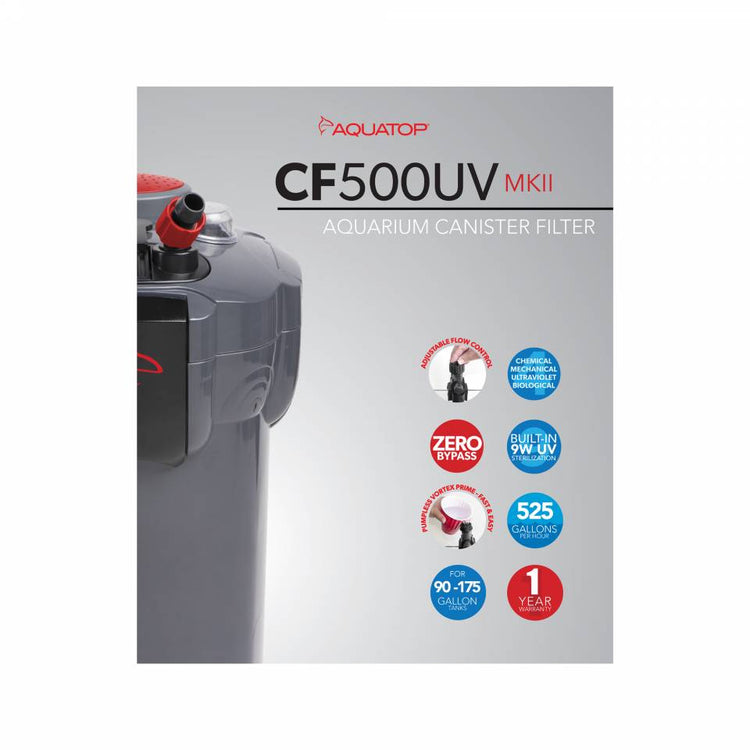 Deliver powerful, complete filtration with the Aquatop CF-500UV MKII Canister Filter featuring Vortex Prime technology and an integrated 9W UV sterilizer. Designed for aquariums up to 175 gallons, it provides 4+1 stages of filtration—mechanical, chemical, biological, and UV sterilization—for exceptional water clarity and quality. With a 525 GPH flow rate and 55W power draw, it offers quiet, energy-efficient performance. Includes all media: bio balls, ceramic rings, carbon, and filter pads for a ready-to-use setup.