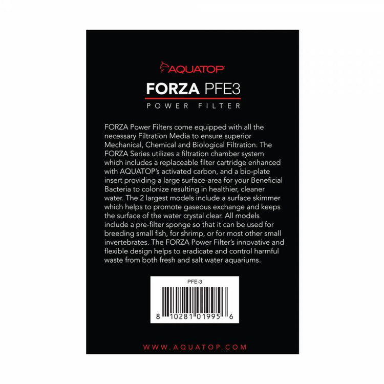 Ensure clean, healthy water with the Aquatop Forza PFE-3 Power Filter. Designed for aquariums 15–25 gallons, this hang-on-back filter provides 80 GPH adjustable flow and features a 3-stage filtration system for mechanical, chemical & biological purification. Ideal for both freshwater and saltwater setups, it includes a large media chamber with premium activated carbon and bio-plates for beneficial bacteria growth. The quiet, efficient operation makes this filter perfect for enhancing water clarity and simplifying maintenance.